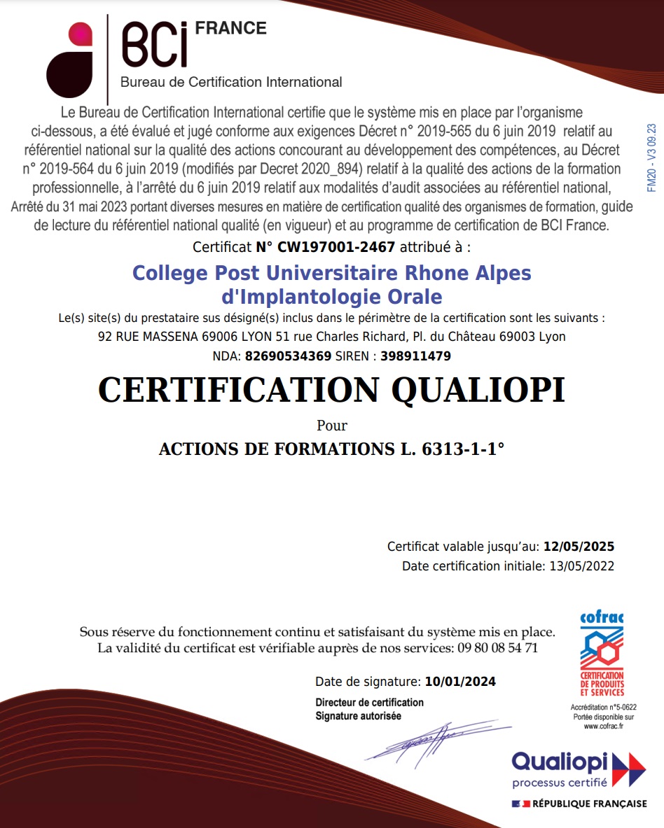 Notre formation en implantologie dentaire bénéficie de la certification Qualiopi